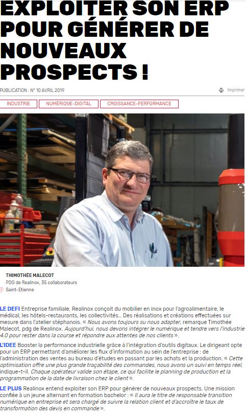 LE PLUS Realinox entend exploiter son ERP pour générer de nouveaux prospects. Une mission confiée à un jeune alternant en formation bachelor: << Il aura le titre de responsable transition numérique en entreprise et sera chargé de suivre la relation client et d’accroître le taux de transformation des devis en commande >>.